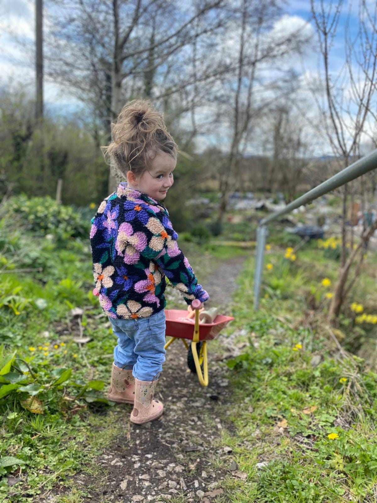 I have a four year old assistant gardener called Lilly. She appeared earlier in the year (2024) and now considers this garden in Cordressagagh as her jungle playground. She has moved her small garden wheelbarrow and tools here and for her fourth birthday we bought her a small watering can in bright colors and matching child gardening gloves.