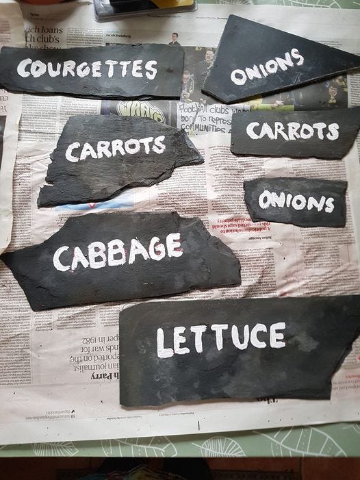 So Bee had the idea of creating some large labels for the various raised beds. Shown above are some of the vegetables which are growing here in Cordressagagh. We will be doing more labels for the celery, beetroot, rhubarb and brussel sprouts.