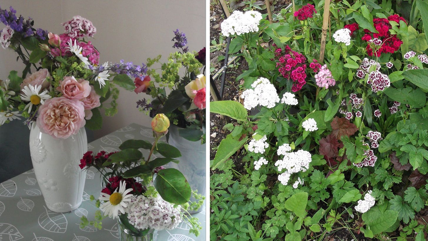 This week Bee started creating some flower arrangements that go in various rooms in the cottage. As you can see there are lots of different flowers in the vases and jars and some are sweet William, Emile Bronte roses, daisies and ladies mantle.