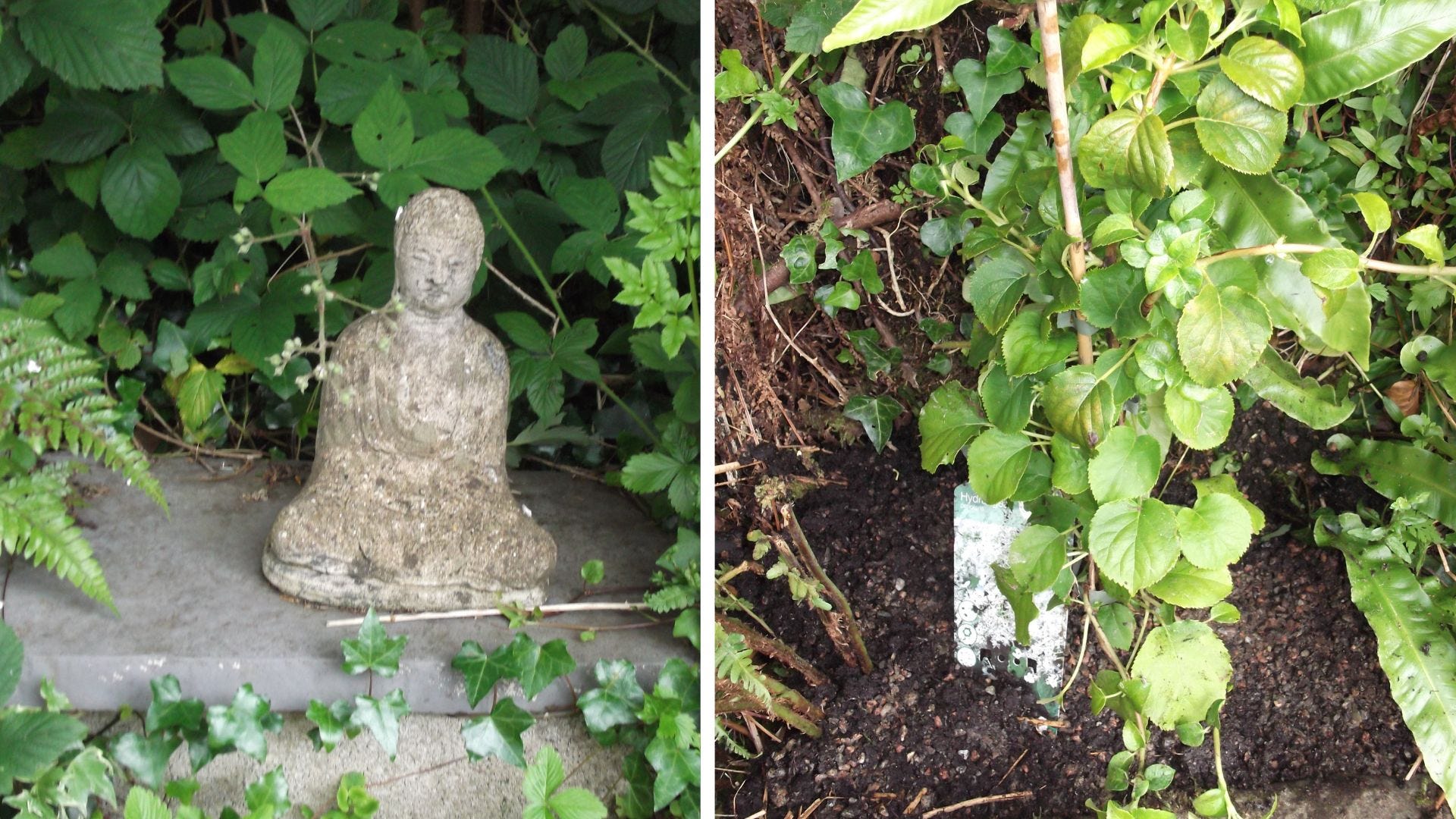 Buddha and Climbing Hydrangea on North side of Cottage