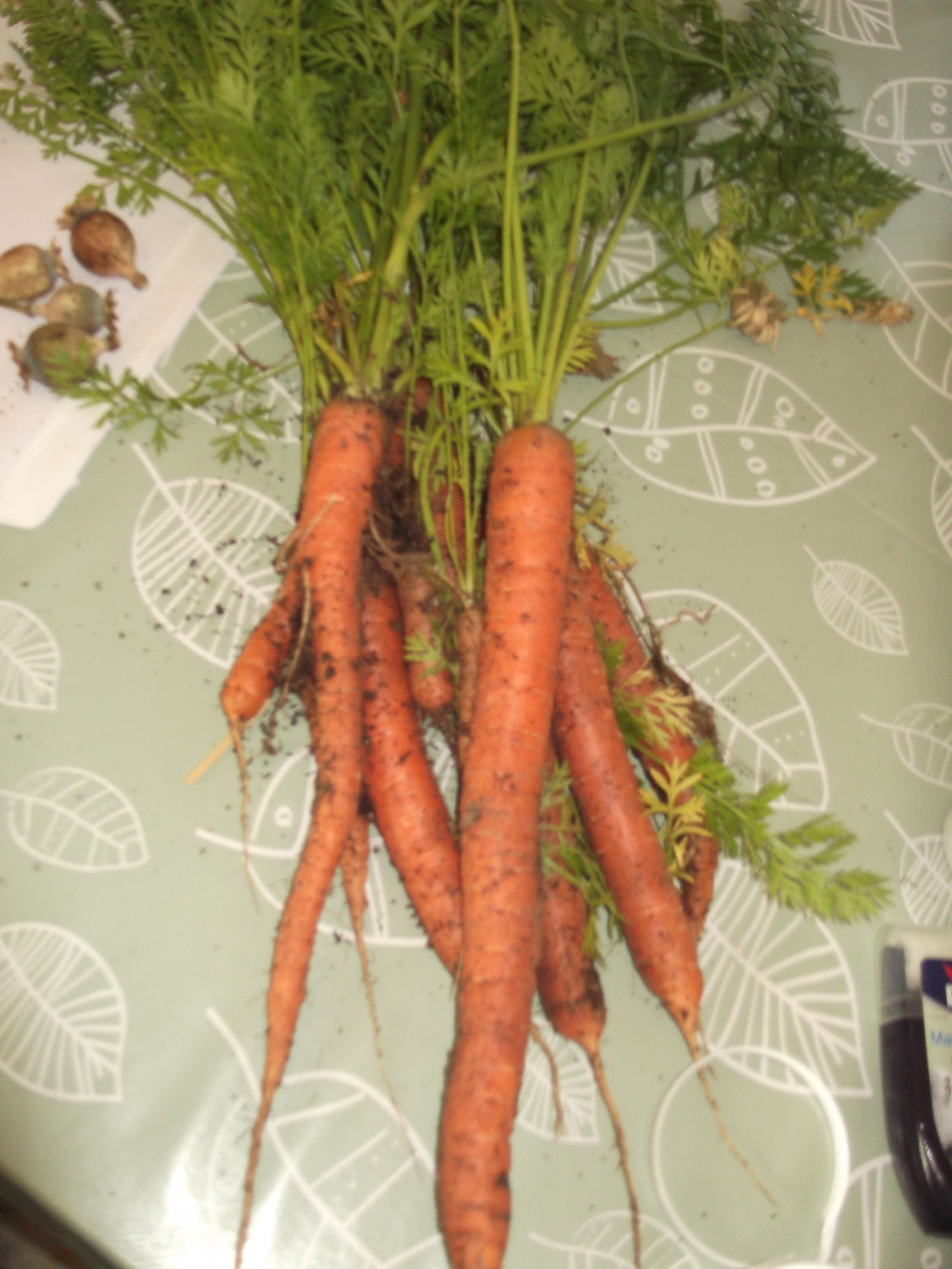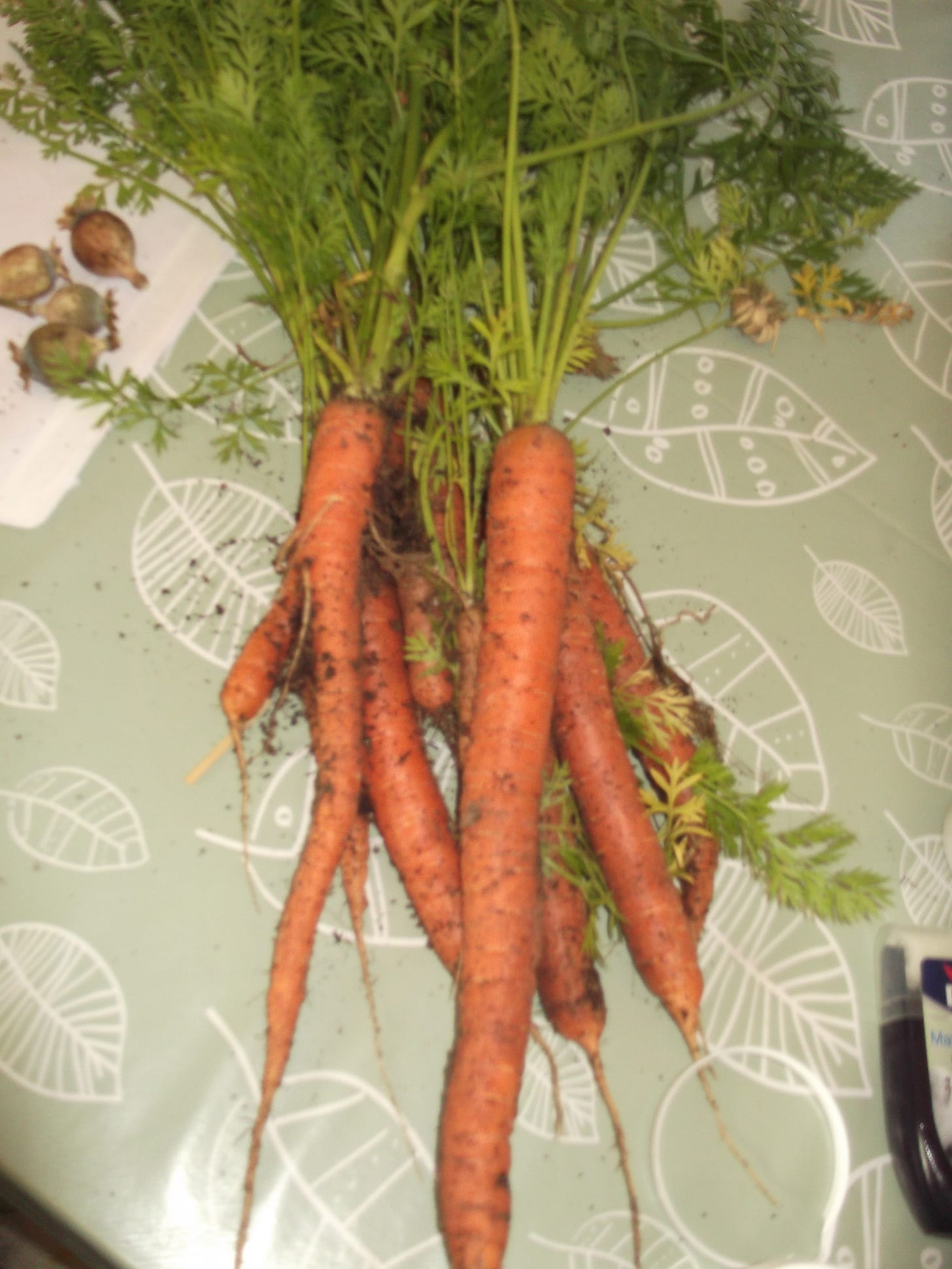 Decided to pull some carrots to see how they are coming on. Am impressed by the size of these carrots but realise that size is not everything. The tops will be going to a bunny who loves them and is the pet of our assistant head gardener Lillie (4 years old).