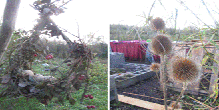 This morning, we had the first real frost of this autumn. The lane was icy and not really safe to walk on even very late in the afternoon. The most important thing is that the birds get fed. Jenny created a lovely bird feeder of willow from the garden which holds suet balls. I think this is what has attracted the return of the blackbird with the white spot on its cheek. I love to see them back. The teasle self-seeds everywhere but it is a free source of feed for the birds and, architecturally speaking, it gives the garden interest when much of it is bare.